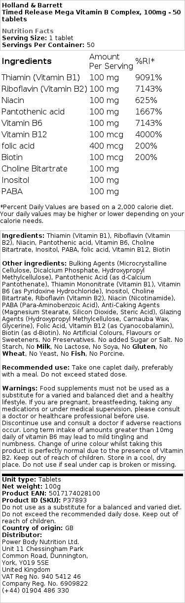Holland & Barrett – timed Release Mega Vitamin B Complex, 100mg – 50 Tablets